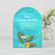 Convites de festa de solteira tropical. Uma bebida azul legal em um vidro pedestal com fatia de limão é cercada por folhas grandes, uma flor de hibisco amarela, e alguns conchas, nesta design. O fundo azul aqua é um gráfico ondulado que inclui algumas turquesas. As linhas geométricas delimitam o texto com seu nome e título de partido em texto mais ousado. Mostrado no papel em forma de arco, com muitas mais seleções, incluindo download instantâneo.