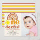 Celebrate your baby's first birthday with our boho-style design featuring the phrase "ONE-DERFUL" in retro typography and a boho-style sunburst. This design is perfect for celebrating your little one. The design features retro colors and can be personalized with your party details. Don't hesitate; get yours now!