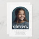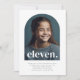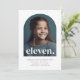 Um simples convite de Aniversário para 11, com sua própria foto em forma de arco e as palavras 'onze' sobre o topo.