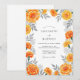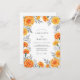 This design features a vibrant border of lush orange blossoms, reminiscent of marigolds, intertwined with delicate gray foliage. The artwork evokes a warm, cheerful, and slightly rustic ambiance, perfect for a late summer or early autumn celebration. The floral arrangement creates an inviting and romantic mood.