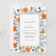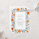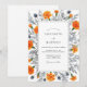 Evoking autumnal warmth, this design features vibrant marigold blooms intertwined with muted, silvery foliage and hints of deep blue buds. The composition suggests a cozy, naturalistic setting with a sophisticated, romantic feel. The color palette is rich with earthy tones, perfect for a heartfelt occasion.