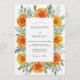 This design features a vibrant cascade of bright orange marigold blooms and lush green foliage. The artwork evokes a joyful, abundant feeling, perfect for a lively gathering. The dominant color palette is rich orange and fresh green.