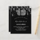 Um convite moderno, na moda e glamouroso para a Quinceañera, festa de aniversário 15. Um fundo preto, decorado com um confete prateado. O nome é escrito com um moderno estilo escrito à mão. Personalize e adicione os detalhes da sua festa. O número 15 é escrito com uma fonte do estilo do balão, padrão leopardo.