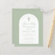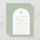 Um primeiro convite à comunhão moderno. Em fundo verde sábio, ele tem um arco branco com dentro de texto verde. A ocasião e o nome são escritos em um roteiro caligráfico elegante; a primeira linha é o texto arquivado.
