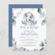 O convite para chá de um bebê amigo do orçamento impresso em papel leve de 4,5x5,6 polegadas, com um elefante de um menino a aquarelas bonitinho segurando um coelhinho recheado cercado por eucalipto macio, aquarela e verde em azul empoeirado, verde sábio e cinzas com o título IT'S BOY e o nome da futura mãe em um roteiro manuscrito. Ideal para entregar aos convidados. ASSISTÊNCIA: para obter ajuda com a modificação/personalização do design, alteração de cor, transferência do design para outro produto ou, se você quiser coordenar itens, entre em contato com o designer ANTES DE ENCOMENDAR através da guia MENSAGEM de bate-papo Zazzle ou por e-mail em makeitaboutyoustore@gmail.com.