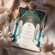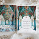 Este luxuoso convite de casamento islâmico mostra um detalhadamente minucioso arco floral e design de cúpula. Flores vibrantes, cor-de-rosa e vermelha, intrincadas vinhas verdes, e sotaques de ouro ornamentado adoram lindamente arcos e colunas, colocados sobre um fundo azul-sereno. O elegante layout inspirado na arquitetura combina riqueza cultural com sofisticação artística, fazer esse design ideal para casais que buscam eterno e artigos únicos de casamento.