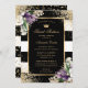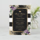 Um convite à apresentação de 16 anos elegante, preto e dourado, de cor floral, com um quadro de ouro adornado com orquídeas roxas e brancas e com brilho dourado.