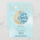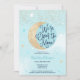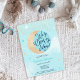 Azul giro Adorável Estamos sobre a festa do chá de fraldas do guião da Lua com ilustrações bonitinhas com lua dourada, estrela azul editável, sinais de zodíaco, nuvens. Com azul pastel editável e azul marinho.