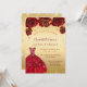 Um convite moderno, na moda e glamouroso para uma Quinceañera, festa de aniversário 15. Um fundo de ouro falso com pó de ouro falso, um vestido e rosas vermelhas, florais. O nome é escrito com um moderno estilo escrito à mão. Personalize e adicione os detalhes da sua festa.