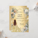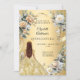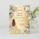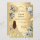 Um fundo com aspecto de ouro. Decorados com os florais brancos e amarelos e uma fita de ouro. Uma garota vestindo uma tiara e um vestido. Personalize e adicione um nome e detalhes.