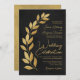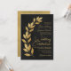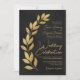 Este convite para o casamento apresenta um design moderno com texto justificável e um tiroteio de folhas pintadas manualmente em tons de ouro. A inscrição apresenta uma fonte moderna e o fundo preto marmoreado adiciona textura e profundidade. Simples, rústico, exclusivo e chic, este convite é uma forma excelente de adicionar estilo contemporâneo à elegância clássica.