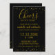 Convite de Aniversário de Ouro com confete dourado e tipografia comemorativa de 50 anos em um fundo preto. Personalize os convites pretos e dourados com detalhes.