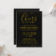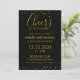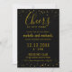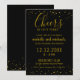 Convite de Aniversário Dourado com confete dourado e tipografia comemorando 50 anos em um fundo preto. Personalize os convites pretos e dourados com detalhes.