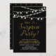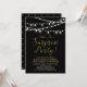 Celebre seu dia especial com este convite de aniversário surpresa elegante! Este design apresenta uma tipografia de roteiro elegante e luzes de corda em um fundo preto. Perfeito para uma festa no jardim, festa no celeiro ou qualquer festa surpresa.