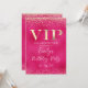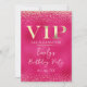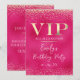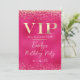 Este convite de festa de passagem de acesso total VIP glamoroso apresenta um design sofisticado em um fundo de estilo texturizado rosa quente. O título VIP é impresso em uma fonte de estilo de folha de ouro, seguido pelo título do evento. Uma faixa de diamantes de brilho dourado acentua as porções superior e inferior. O local e a hora da festa ou evento estão impressos no verso. É perfeito para uma festa de aniversário, festa de 16 anos, chá de noiva ou outra celebração elegante.
