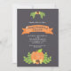 Este convite de jantar de Friendsgiving apresenta gráficos fofos de uma abóbora de cores vibrantes e bolotas em um fundo cinza escuro.