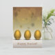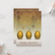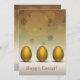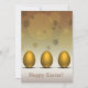 Uma ilustração de Páscoa moderna e abstrata com 3 ovos de Páscoa dourados em um fundo bokeh com flores abstratas.