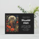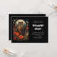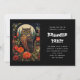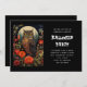 A Halloween invitation with a cool looking owl with a piercing stare. A full moon in the back with a garden of red flowers.