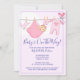 Bebê Whimsical amontoado em roupas cor-de-rosa afixado a uma linha de roupa com Stork e bundle bebê no fundo, convite para chá de fraldas de menina. Personalize com as informações e o local do evento. Típica fofinha em azul. Grande pacote de bebês no lado inverso do convite!
