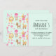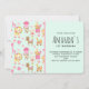 Um convite de aniversário com um padrão caprichoso que inclui uma coleção de brinquedos e animais deliciosos para crianças.