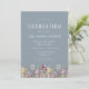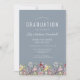Uma bela borda floral de aquarela de flores silvestres decora a borda inferior deste convite de festa de formatura de vassouras. Personalize o texto branco em um fundo azul empoeirado com o nome do formando em script de escrita manual; o ano escolar e de classe em sans serif; e os detalhes de data, local e RSVP em fontes serif. A parte de trás do cartão apresenta um padrão de flor silvestre coordenado em um fundo azul empoeirado.