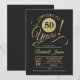 Convite de festa de 50º aniversário em preto e dourado. Cartão de convite elegante com padrão de quadro-negro e fonte de letra tipográfica. Saúde aos 50 anos! Perfeito para uma celebração de aniversário de cinquenta anos dourados e sofisticados.