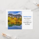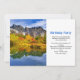 Um convite de aniversário com uma bela fotografia. Montanhas pedras com uma floresta de outono em cores brilhantes. Um lago tranquilo reflete as montanhas, árvores e gramíneas.