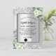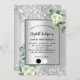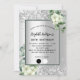 Fundo de aspecto fino prateado decorado com flores brancas, flores, verde eucalipto e brilho falso prateado, faíscas. Personalize e adicione seu nome e detalhes da festa. Letras negras. Clique em "editar design" para editar as cores, adicionar/excluir mais blocos de cores ou fazer com que a paleta seja menor se você tiver muito texto. Edite a cor da borda e a cor de preenchimento.