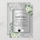 Fundo de aspecto fino prateado decorado com flores brancas, flores, verde eucalipto e brilho falso prateado, faíscas. Personalize e adicione seu nome e detalhes da festa. Letras negras. Clique em "editar design" para editar as cores, adicionar/excluir mais blocos de cores ou fazer com que a paleta seja menor se você tiver muito texto. Edite a cor da borda e a cor de preenchimento.