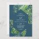 Este convite casual de marinho de palma tropical selvagem hexágono é perfeito para um casamento de praia ou destino. A design apresenta um exótico conjunto de folhas de palmeiras de banana-d'água verde, samambaias, folhagem, plantas botânicas e verde sobre fundo azul-marinho para uma sensação tropical de verão.