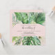 Este convite de casamento quadrado de palma tropical selvagem é perfeito para um casamento de praia ou destino. A design apresenta um exótico conjunto de folhas de palmeiras, samambaias, folhagem, plantas botânicas de cor verde-aquática, de fundo cor-de-rosa-esbranquiçado para uma sensação tropical de verão.