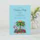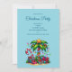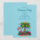 Um convite de Natal com uma imagem festiva da estação. Uma palmeira tropical decorada com luzes festivas e uma estrela no topo. Um enorme bastão de doce vermelho e branco saindo da areia. Presentes de Natal sob a árvore. Caprichoso e divertido.