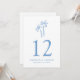 Coloque a cena para sua comemoração costeira com esta placa de número da mesa de casamento na moda, com palmeiras azuis desenhadas à mão sobre um fundo branco limpo. Ideal para casamentos de praia, tropicais ou de destino, esta design complementa lindamente a sua recepção. Adicione os nomes do casal, a data do casamento e o número da tabela para completar a aparência. Este cartão mede 5"x7". Edite cada número e adicione-o ao carrinho.