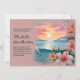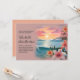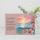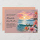 Convite de festa de aniversário feminino com pintura em aquarela de um belo pôr do sol em uma praia coberta de palmeiras tropicais e flores.