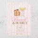Host a charming celebration with this pink Brunch & Bubbly bridal shower invitation, featuring a delicate watercolor champagne coupe with a pink ribbon and a stack of pancakes topped with fresh berries. The soft hand-painted pink stripes give it a sweet, feminine, and modern look — perfect for a bride who loves elegant brunch themes.