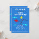 Kites Bonitos Desenhando Convite de festas Aniversário de criança Azul. Design para crianças com dois papagaios em cores vermelha e amarela. As pipas estão voando no céu entre nuvens. Adicione seu texto.