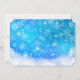 Convite de festas de Natal com uma silhueta preta de papais noeis cavalgando em seu trenó sendo puxado por sua rena voando pelo céu. O fundo é um design de floco de neve gelado azul gelado.