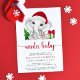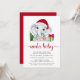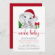Férias de Natal feliz convite para chás de bebês com "Papais noeis Baby" em um roteiro na moda vermelho com pestanas, uma aquarela fofa de um bebê elefante vestindo um chapéu de Papai Noel com uma árvore de Natal, uma cana doce vermelha e verde e presentes, o nome da futura mãe na elegante tipografia vermelha e os detalhes do chá em uma simples tipografia moderna.