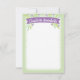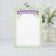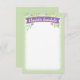 Esta doce papelaria personalizada apresenta uma faixa de roxo com flores em lilás e verde-menta sobre um fazer verde-primavera este cartão-nota personalizado uma escolha de excelente para uma menina que está começando a aprender a arte da correspondência escrita e a agradecer notas.