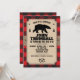Um fundo de xadrez de búfalo vermelho contrasta com um painel de aparência de papel kraft segurado por uma tira de aniagem neste convite temático de Northwoods. O painel contém as informações do evento, apresentando um urso entre duas árvores de pinheiro. O machado cruzado forma um logotipo personalizado abaixo. Ótimo para aniversário, festa de despedida de solteiro, evento sazonal ou celebração temática de xadrez de búfalo ou lenhador. Disponível com produtos correspondentes.