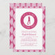 O design personalizado do convite de aniversário de golfe feminino apresenta uma silhueta de golfe feminina, em forma rosa, sobre uma forma branca, junto com o texto curvo humorístico "É hora de pintar o chão!", em letra branca nítida, num círculo rosa. Personalize o modelo com o nome e os detalhes em letras e scripts cor-de-rosa correspondentes. O convite é acompanhado de uma xadrez rosa-estilo-argyle com dois tons, que também se repete no verso do convite.