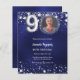 Um convite para fotos moderno e na moda para uma festa de aniversário 90. Um fundo azul marinho, decorado com estrelas. A cor azul é irregular. Personalize e adicione sua foto e detalhes da festa. 1 folha = 1 convite impresso de borda a borda.