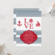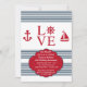 Um convite de aniversário espirituoso e náutico para amantes e marinheiros. O fundo branco apresenta listras azuis e motivos náuticos vermelhos. A palavra amor tem um leme no lugar da letra "o". (FP)