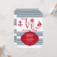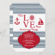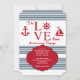 Um convite de aniversário espirituoso e náutico para amantes e marinheiros. O fundo branco apresenta listras azuis e motivos náuticos vermelhos. A palavra amor tem um leme no lugar da letra "o". (FP)