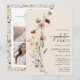 Celebre seu marco com este Convite de Festa de Formatura de Primavera com um design rústico boho de flores silvestres e uma colagem de 3 fotos no verso. Perfeito para uma festa de formatura do ensino médio ou faculdade, este convite floral apresenta flores silvestres vintage, gramíneas secas e folhas em tons quentes de bege, marrom, ferrugem, terracota, roxo, azul, rosa e laranja queimado.