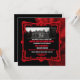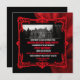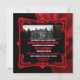 O convite apresenta um tema assustador com uma moldura vermelha em estilo barroco que encapsula a essência de um clássico evento de mistério de assassinato. A imagem central mostra uma mansão em silhueta contra um céu escuro e ameaçador, sugerindo uma noite de intriga emocionante. O contraste do vermelho com o fundo preto aumenta a atmosfera sinistra, prometendo uma noite em que os convidados estarão imersos em uma narrativa de suspense para desvendar um crime fictício. A fonte gótica e as árvores sombrias sugerem o apelo atemporal das histórias de detetive, convidando os participantes a entrar em um mundo de enigmas e segredos em uma grande propriedade onde cada canto guarda uma pista.