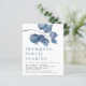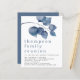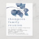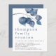 Convite para o Partido da Reunião da Família Folhagem Azul. Um alternativo MENOR de 4,5" x 5,6", compatível com o orçamento. Disponível em um STOCK de PLACA SEMI GLOSS 110 lb ou um STOCK de PAPEL THINNER SATIN FINISH 80 lb. Os envelopes são um extra opcional. Folhas azuis de cor grande moderna decoram a parte superior e o cabeçalho da ocasião é grande abaixo em na moda com os detalhes na parte inferior. Personalize facilmente o texto para seus próprios detalhes.