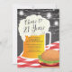 Anima-se a 21 anos de convite de churrasco de aniversário com caneca de cerveja e hambúrguer em um moderno fundo de chalkboard com luzes de jarro de pedras suspensas