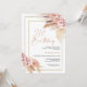 Blush Boho Pampas Grass aniversário de 21 anos Invitation Bohemian inspirou um convite de aniversário de 21 anos com dois arranjos florais cor-de-rosa-terra com grama pampas e uma imagem caligráfica moderna como um título em uma textura falsa de ouro rosa. Ideal para quem procura um doce convite de 16 anos inspirado na boêmia.