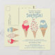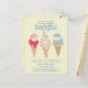 Novo para o Verão de 2024. Nosso cartão-postal de convite "Sorvete, Gritar Que Todos Nós Gritares Surpresa!". Três cones retrorados de sorvete de aquarela com sorvete vermelho, branco e azul patriótico e aspersores ocupam o palco central acima de seus detalhes de festa de aniversário.